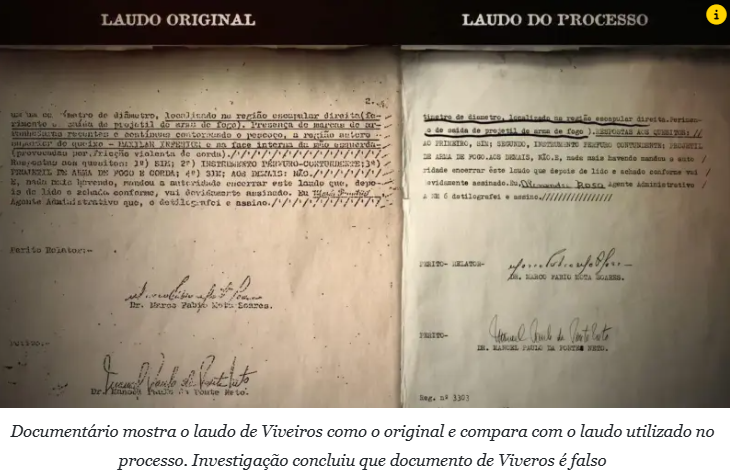 O laudo falso mostrado pela Brasil Paralelo aponta que Viveros teria ferimentos que corroboram a sua versão de que foi rendido por assaltantes. No entanto, a análise pericial da Polícia Forense do Ceará mostra que o laudo é uma “montagem”.