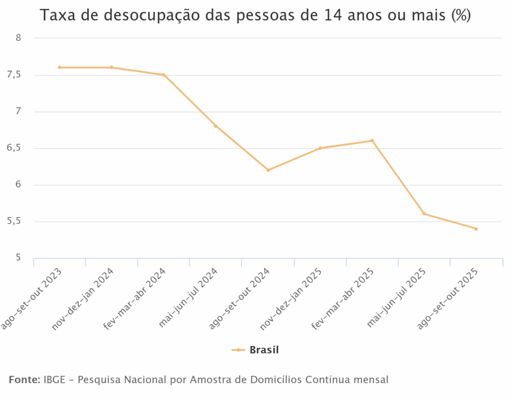 A taxa de desocupação do trimestre móvel encerrado em outubro de 2025 caiu para 5,4%, a menor taxa da série histórica, que teve início em 2012. Frente ao trimestre móvel de maio a junho (5,6%), a taxa recuou 0,2 ponto percentual (p.p.). Comparada ao trimestre encerrado em outubro de 2024 (6,2%), o indicador caiu 0,7 p.p. Os dados são da Pesquisa Nacional por Amostra de Domicílios (Pnad) Contínua, divulgada hoje (28) pelo IBGE.