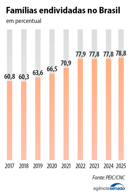 O endividamento alcançou 78,8% das famílias — o maior percentual desde novembro de 2022 — e 30,4% delas estavam com dívidas em atraso. Em 2018, eram 60,3% das famílias endividadas, um aumento de quase 20 pontos percentuais em sete anos, como aponta Pesquisa de Endividamento e Inadimplência do Consumidor (Peic), da Confederação Nacional do Comércio de Bens, Serviços e Turismo (CNC).