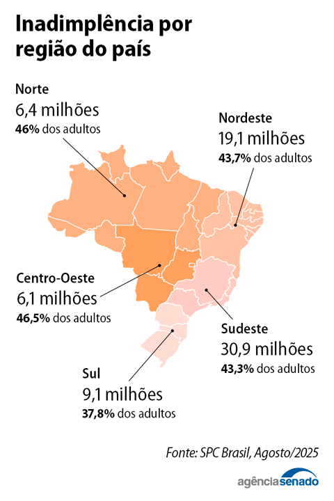 Em agosto de 2025, eram 71,7 milhões de pessoas nesta situação. O número cresceu 9,2% em relação ao mesmo período de 2024, consolidando um novo recorde histórico, de acordo com levantamento da Confederação Nacional de Dirigentes Lojistas (CNDL) em parceria com o Serviço de Proteção ao Crédito (SPC Brasil). Na comparação mês a mês, o total de inadimplentes subiu 0,71% de julho para agosto, mostrando que o problema se agrava de forma contínua.