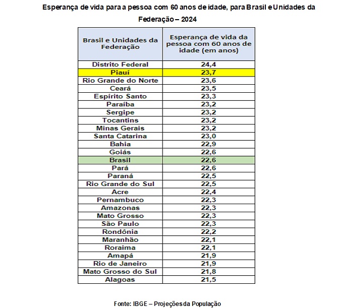 A esperança de vida para a pessoa de 60 anos de idade no Piauí era superior à registrada para o Brasil (22,6 anos). Dentre as unidades da federação, os maiores indicadores ficaram com: Distrito Federal (24,4 anos), Piauí (23,7 anos) e Rio Grande do Norte (23,6 anos). Os menores indicadores ficaram com: Alagoas (21,5 anos), Mato Grosso do Sul (21,8 anos) e Rio de Janeiro (21,9 anos).