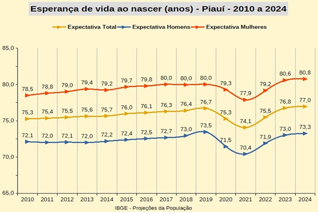 Desde 2010 a esperança de vida ao nascer dos piauienses vinha em crescimento contínuo, interrompido pelo advento da pandemia da Covid 19, com redução da esperança de vida nos anos de 2020 (75,3 anos) e de 2021 (74,1 anos), tendo retomado a trajetória de alta a partir de 2022.