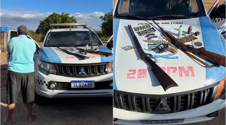 No local, os policiais apreenderam um verdadeiro arsenal: um rifle calibre .44 com quatro munições, um revólver calibre .38 com 13 munições intactas e uma deflagrada, uma espingarda calibre .36 com 18 cartuchos e uma foice.