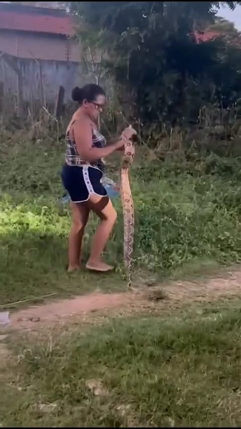 Em um gesto ainda mais inusitado, Rosinha chegou a apoiar a cobra sobre um dos ombros enquanto a transportava, demonstrando tranquilidade e aparente familiaridade com o manejo do animal. Apesar do susto, não há registro de feridos.