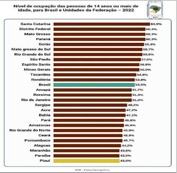 A proporção de pessoas ocupadas no mercado de trabalho piauiense em 2022 foi de 43% do total de pessoas de 14 anos ou mais de idade, o menor nível do país no ano de 2022, seguido da Paraíba, com 43,5%, e do Maranhão, com 43,6%. No Brasil, o nível de ocupação no mercado de trabalho chegou a 53,5%, um total de 10,5 pontos percentuais acima do registrado pelo Piauí. O estado de Santa Catarina apresentou o maior nível de ocupação, com 63,5%, seguido do Distrito Federal, com 60,4%, e Mato Grosso, com 60,3%. São informações obtidas pelo Censo Demográfico realizado em 2022.