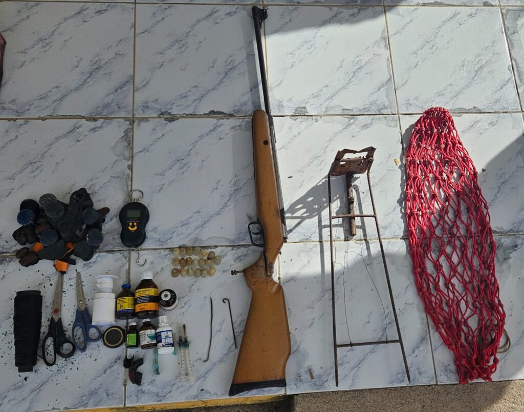 Durante o cumprimento de um mandado de busca e apreensão, os agentes encontraram 36 aves mantidas em condições irregulares, sendo 20 cabeças-vermelhas, 6 azulões, 1 papa-capim, 1 galo-de-campina e 8 galos com evidentes sinais de envolvimento em rinhas, como cicatrizes, pescoços depenados e uso de esporas artificiais. O local também abrigava estruturas típicas desse tipo de crime, como 23 gaiolas, 4 viveiros, um rinheiro, além de 19 esporas cortantes, medicamentos de uso veterinário, seringas, cronômetro e redes de captura.